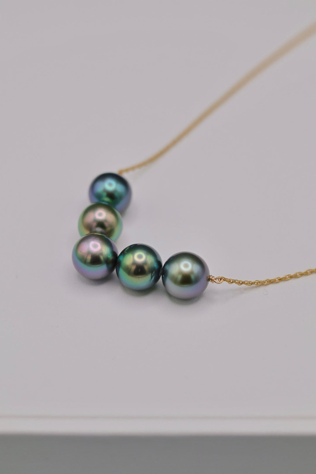 Le Collier Madame Valentina incarne le sommet du raffinement et de la féminité. Conçu pour la gamme Prestige, il célèbre la splendeur des perles de Tahiti à travers un design épuré et majestueux. Ses cinq perles rondes de 10 mm (grade A), soigneusement assorties, dévoilent des couleurs d’exception, oscillant entre paon, vert et bleu profond, avec un lustre et un orient incomparables.