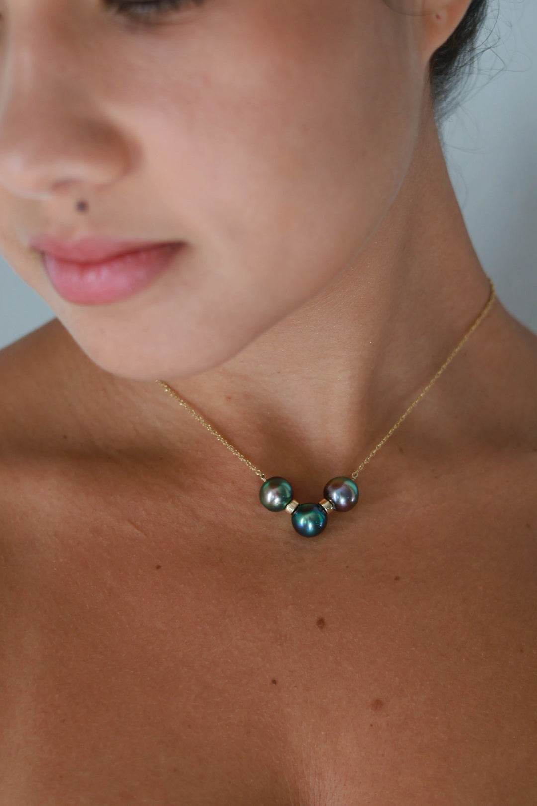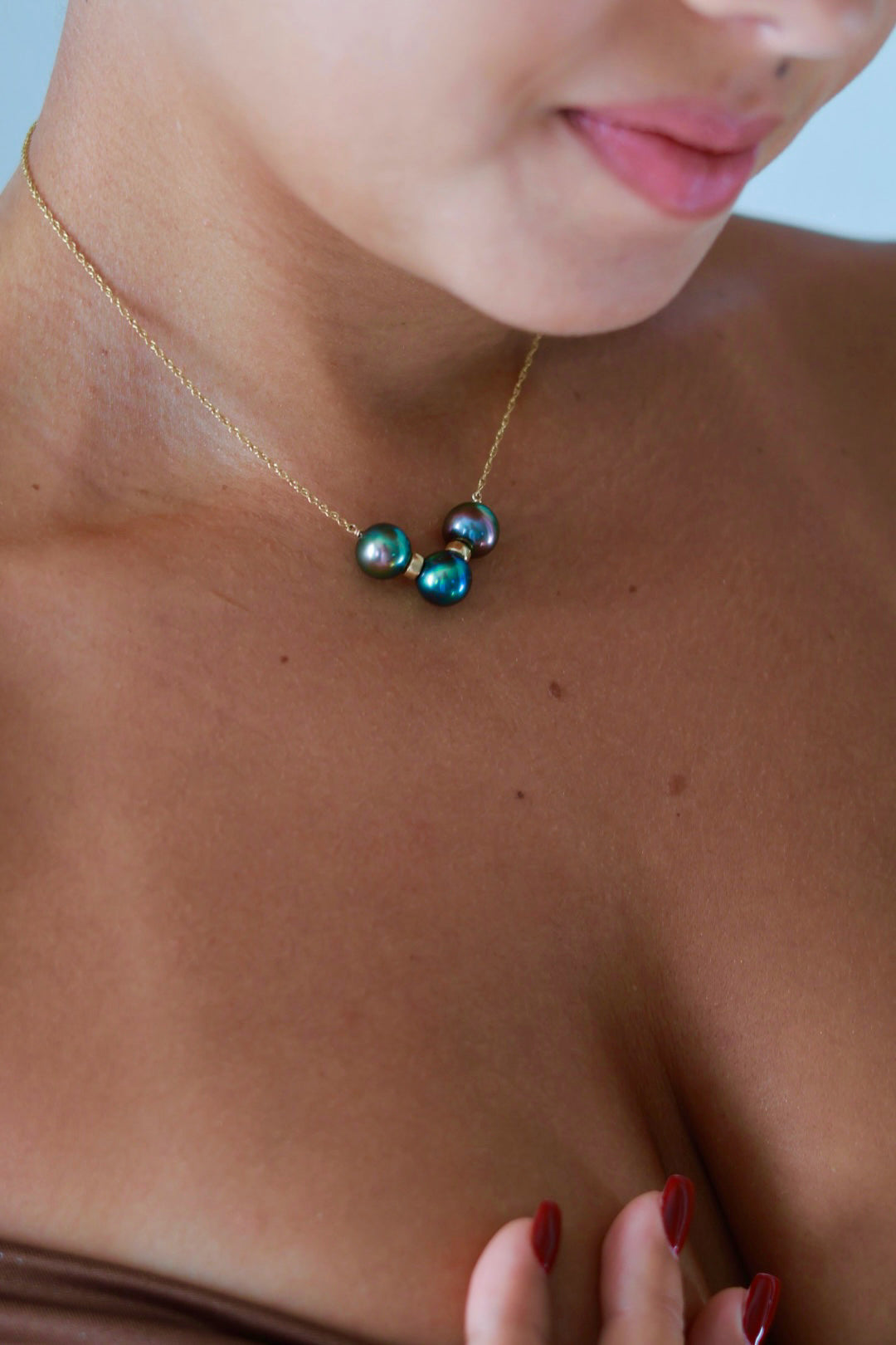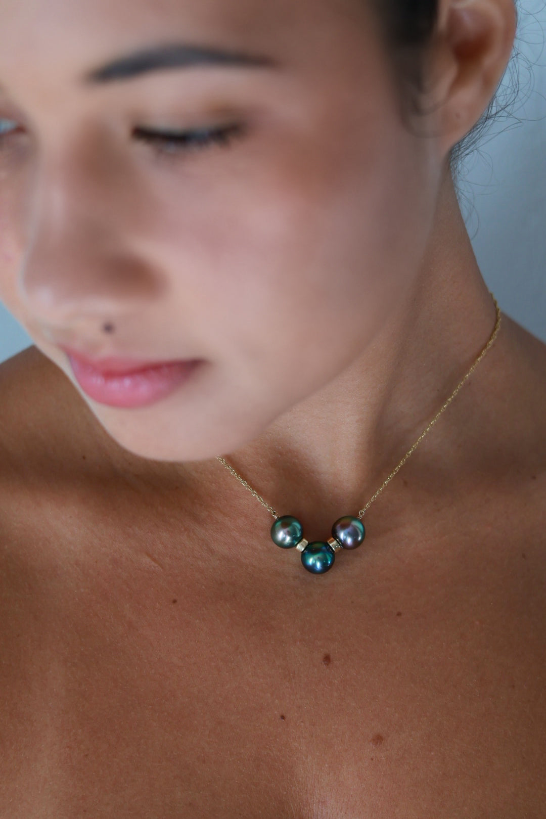 Le Collier Miss Valentina est une ode à la finesse du luxe polynésien. Conçu pour la gamme Prestige, il met en lumière la beauté pure des perles de Tahiti dans un design à la fois minimaliste et somptueux. Ses trois perles rondes de 10 mm (grade A) révèlent des couleurs intenses et changeantes, du paon profond au vert lumineux, en passant par des reflets bleus soyeux — une harmonie rare au lustre et à l’orient incomparables.